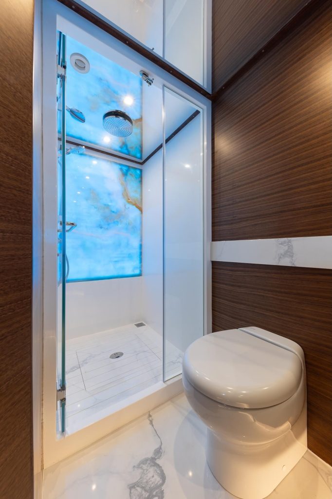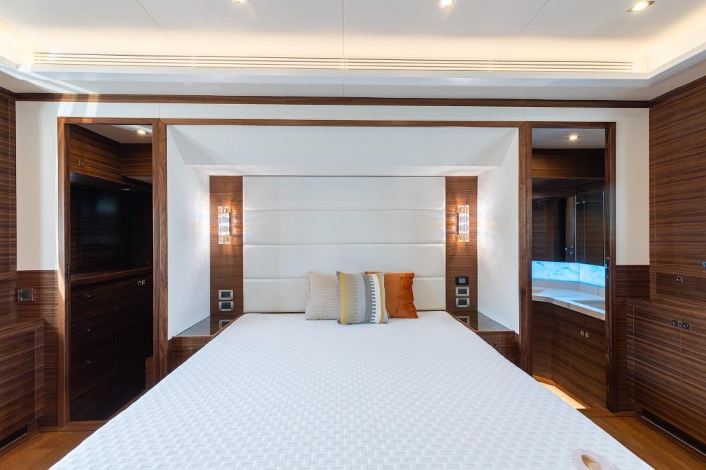 The Selene 6420 is configured with a functional four-cabin layout: comprising three guest staterooms and a separate crew cabin, delivering an excellent balance of comfort, privacy, and practicality for extended voyages. This arrangement prioritizes privacy and practicality for extended cruising. The interior is finished in walnut wood, selected for its structural stability, and modern aesthetic. The galley is equipped with stone countertops and integrates a waterfall-edge island bar. This design optimizes workspace efficiency and encourages interaction within the main saloon, blending utility with a streamlined appearance.